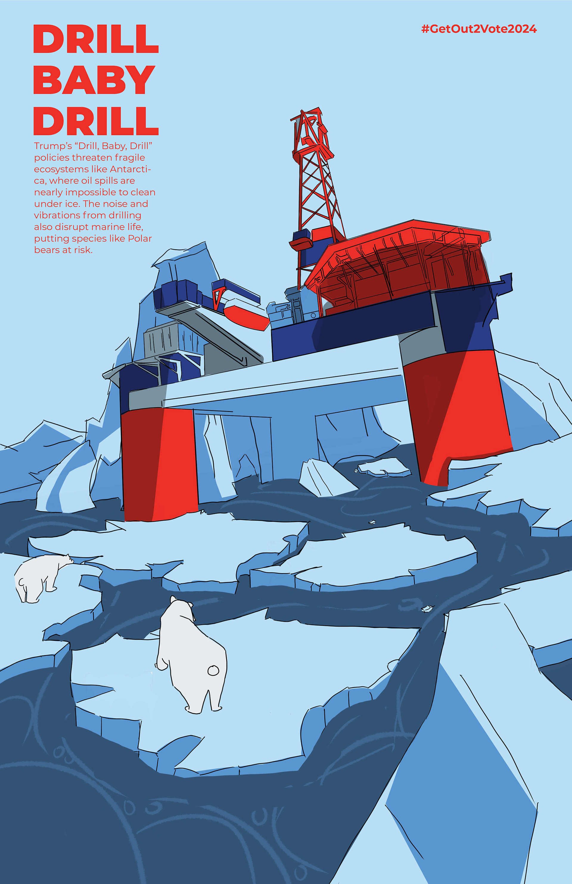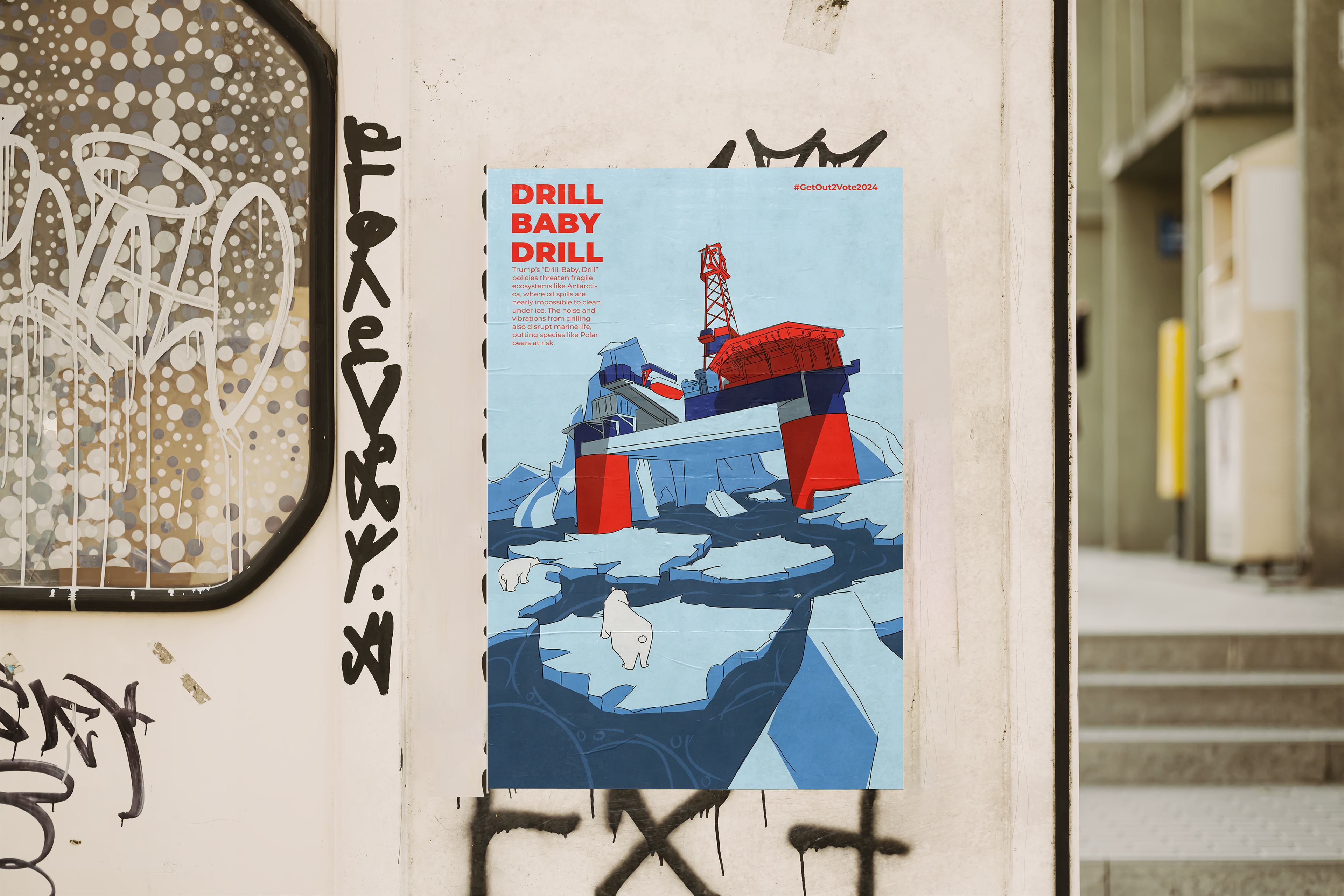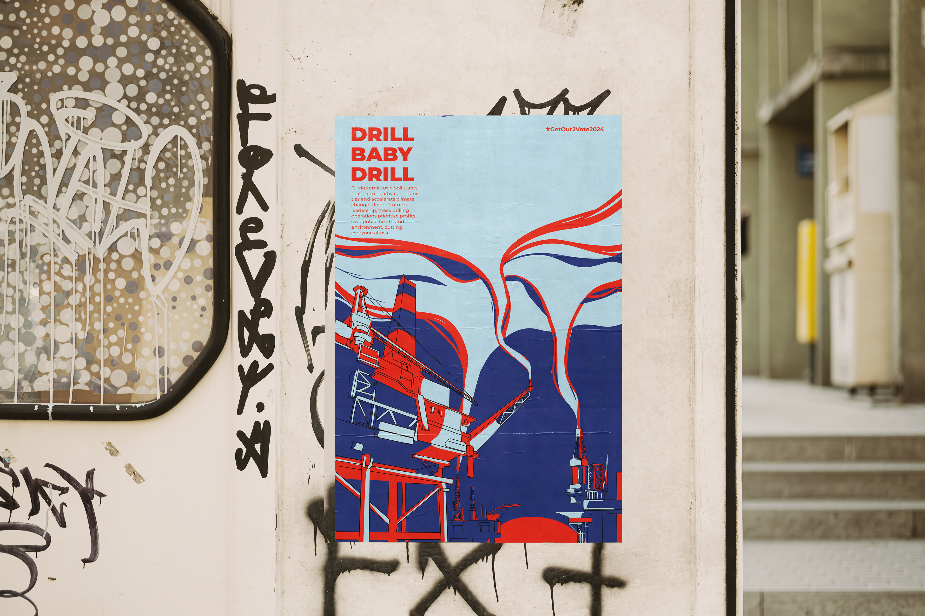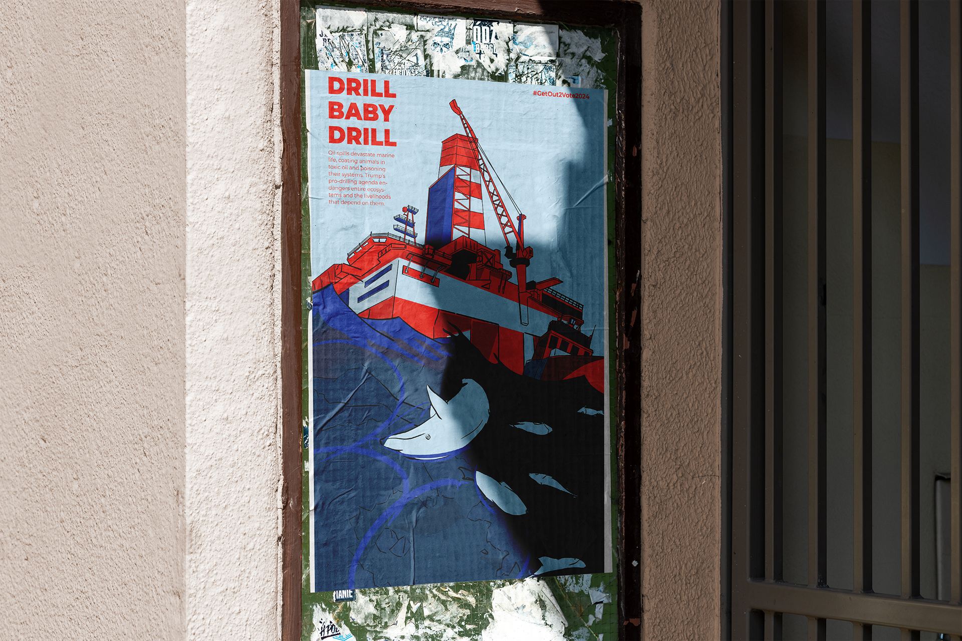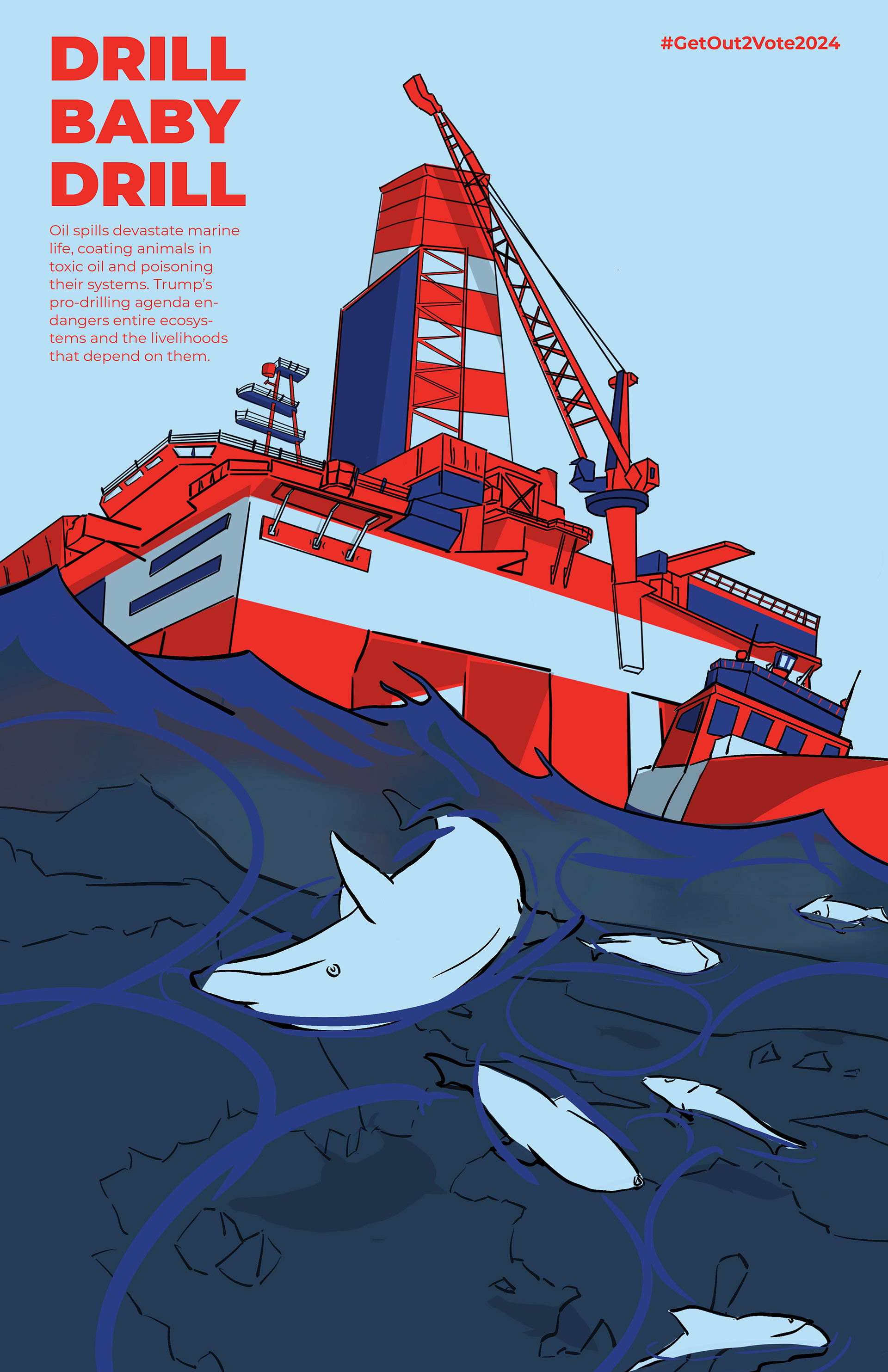 This poster illustrates the deadly aftermath of offshore oil spills, showing dolphins and fish floating lifelessly in polluted waters. The looming rig was placed this way to dominate the composition, emphasizing how pro-drilling policies poison ecosystems and endanger marine life.