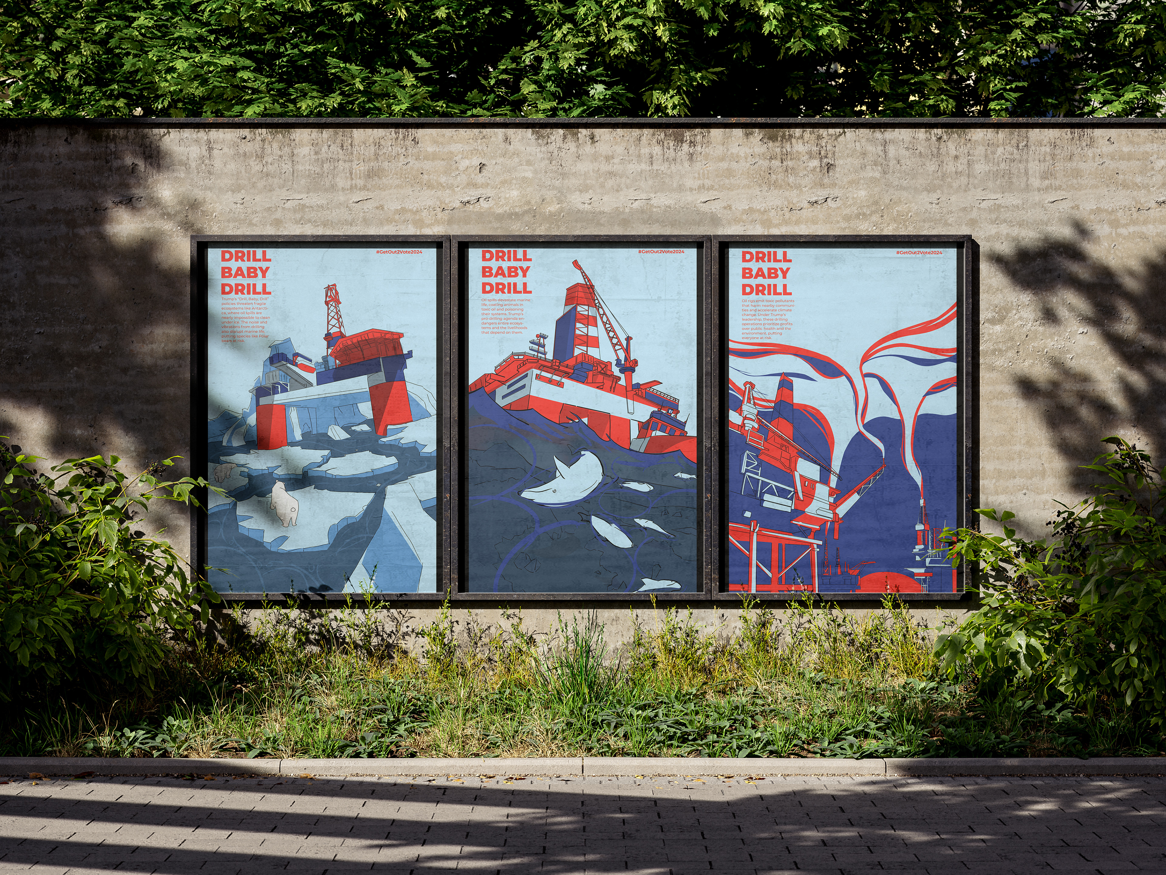 A three-part poster series critiquing Trump’s “Drill, Baby, Drill” policies by