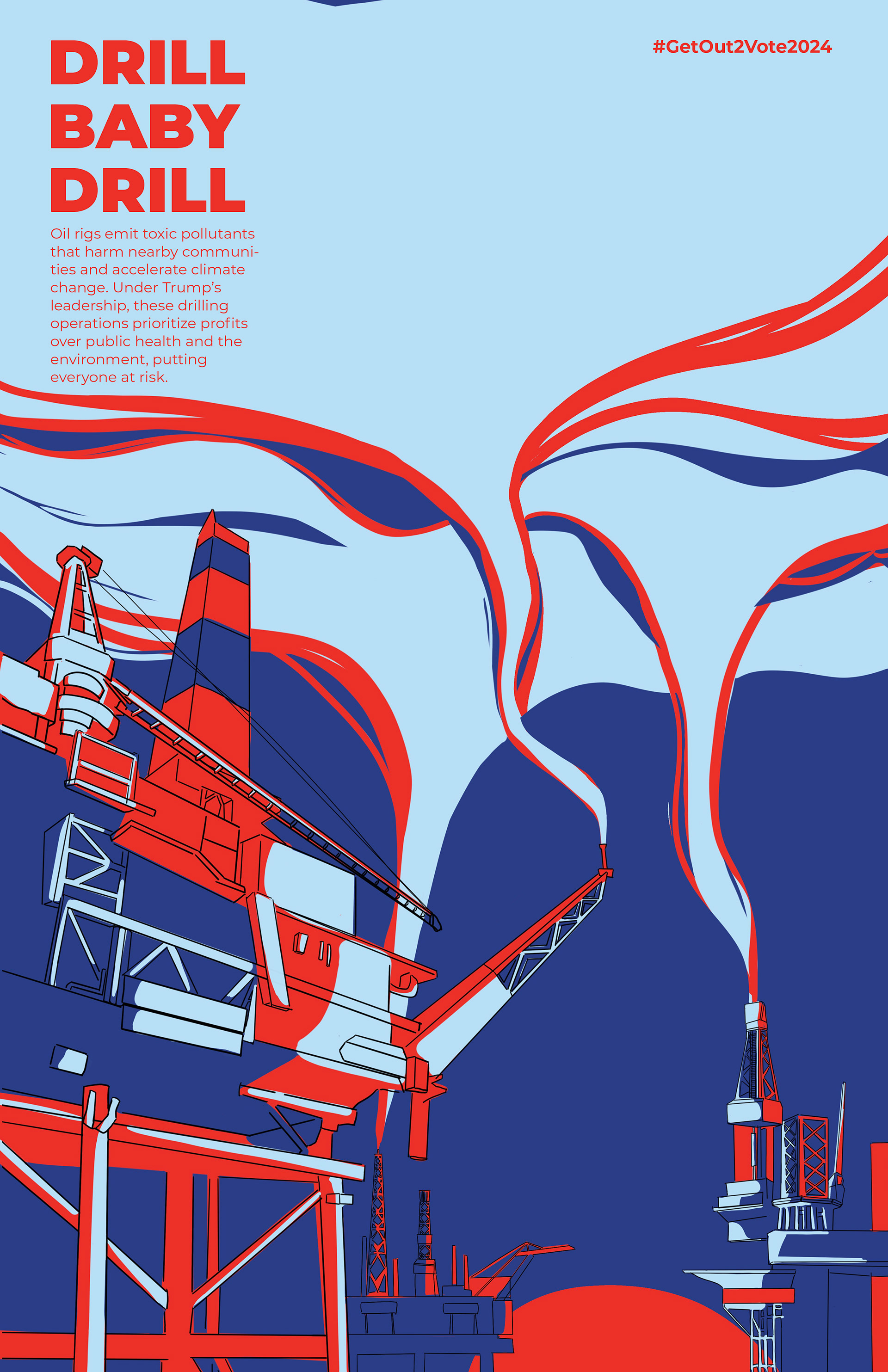 This poster uses a bold red, white, and blue color scheme to mimic patriotic imagery while highlighting the environmental damage caused by oil drilling. Toxic smoke winds through the sky, showing how these rigs pollute nearby communities and speed up climate change.